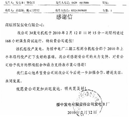 2009年9月27日8時,海門一期4 *1000MW國產(chǎn)臨界機組,#2機圓滿完成了168小時滿負荷運行,順利投產(chǎn)發(fā)電。海門電廠特地為我公司發(fā)來感謝函,對我公司的優(yōu)良服務(wù)表示感謝。海門一期4 *1